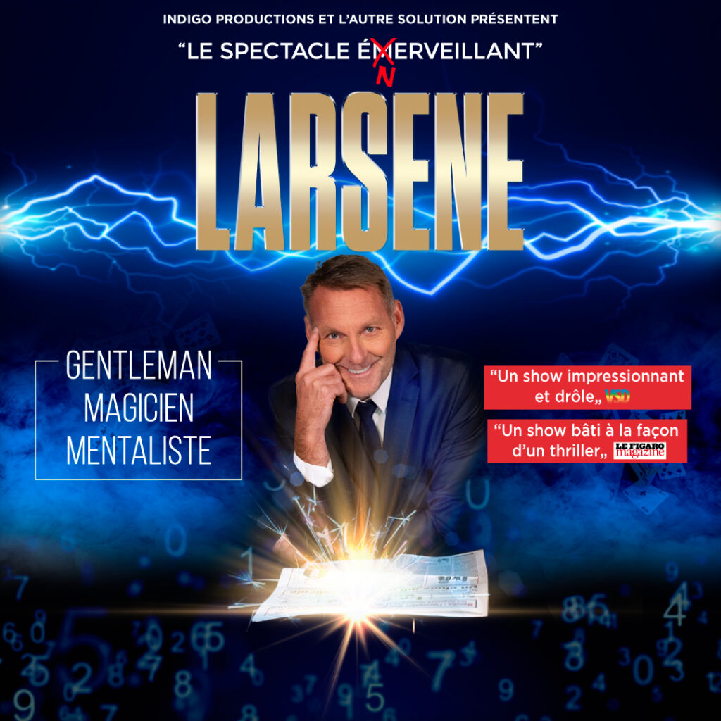Tant de célébrités du monde du cinéma, du sport, des médias notamment voient en lui « le plus grand magicien de tous ! » que l’on pourrait utiliser mille superlatifs pour décrire le talent et la dextérité de LARSENE, l’immense magicien-mentaliste. Mille superlatifs comme autant de morceaux de ce journal qu’il réduit en miettes chaque soir sur scène pour mieux le reconstituer, à l’identique, sous les yeux ébahis de spectateurs incapables de comprendre ce qu’il se passe… Alors certes, LARSENE est un véritable alchimiste de l’interaction corrosive avec un public dont il joue avec agilité et bienveillance… même si en effet, « ça peut parfois énerver ! » de ne pas percer ses insondables mystères.